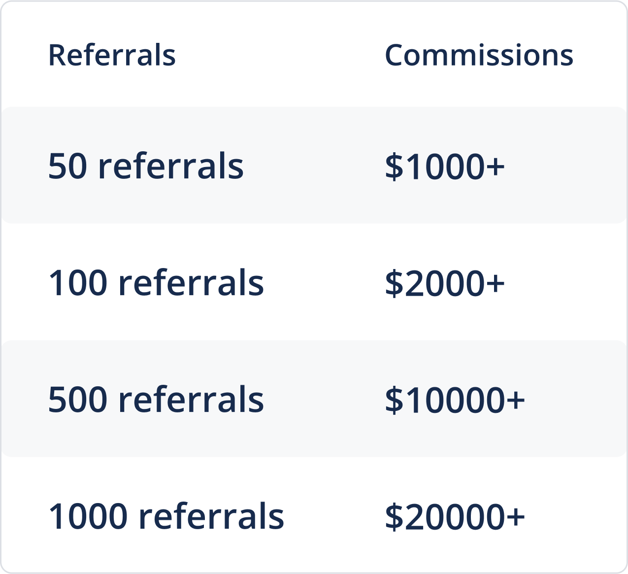 Just provide a few details to sign up and you’ll receive a confirmation email. Once your partnership is confirmed, you’ll receive a personal referral link you can start sharing right away and get access to your referral dashboard.