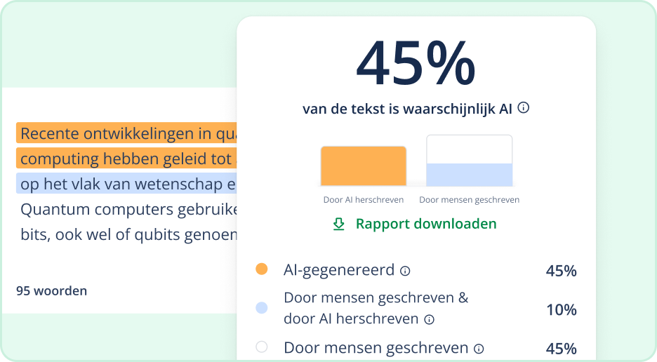 Onze AI-detector markeert tekst die mogelijk door AI is gegenereerd. Gebruik je gezond verstand bij het beoordelen van de resultaten. Vertrouw nooit alleen op AI-detectie om beslissingen te nemen die iemands carrière of academische status kunnen beïnvloeden.